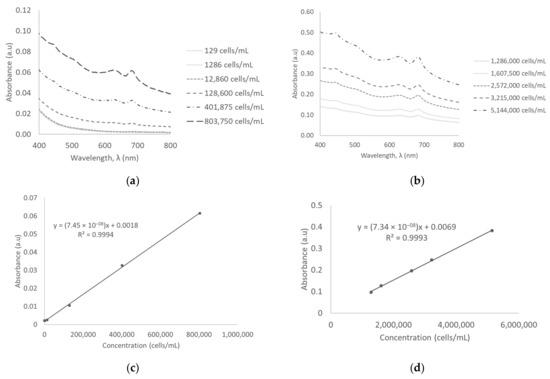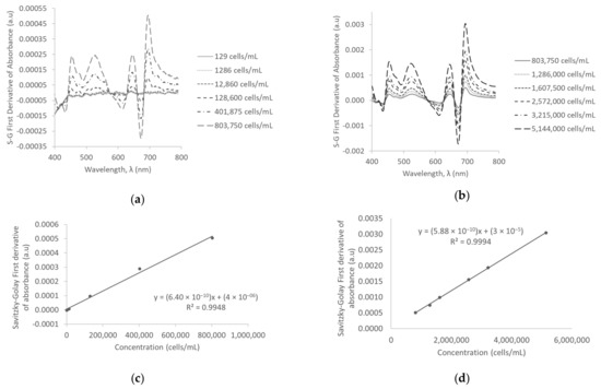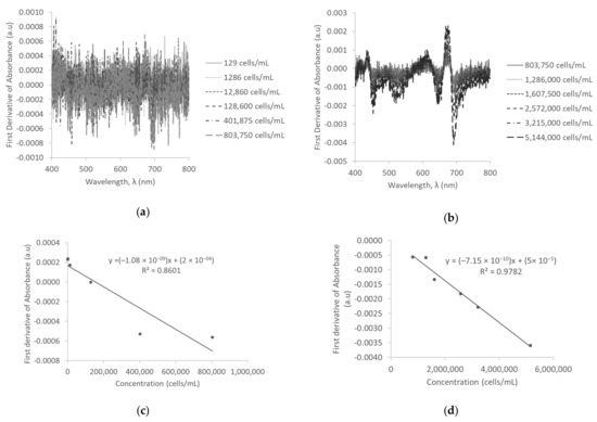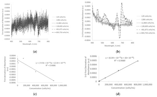 Smoothening of the data using Savitzky-Golay coefficients for the first derivative resulted in sharp and distinct peaks at low, medium, and high concentrations. However, similar to the zero-order derivative spectra, the peaks for 129 cells/mL, 1286 cells/mL, and 12,860 cells/mL were not identified on the spectral scan. The Savitzky-Golay first derivative of absorbance spectra for low and medium concentrations are illustrated in Figure 3a,b, respectively. The standard calibration curve of concentration versus Savitzky-Golay first derivative of absorbance revealed a linear trend and strong positive correlation between the Savitzky-Golay first derivative of absorbance and concentration (R2 = 0.9948 at low concentrations; R2 = 0.9994 at medium concentrations; R2 = 0.9999 at high concentrations). The standard calibration curves of low and medium concentrations are illustrated in Figure 3c,d. The method detection limit using the Savitzky-Golay first derivative of absorbance was calculated to be as low as 41,802 cells/mL. This improvement in detection limit was approximately eight times that of zero-order derivative of absorbance.