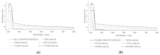 The next phase investigated potential differences in the absorbance spectra of toxigenic (M. aeruginosa CPCC 299) and non-toxigenic (M. aeruginosa CPCC 632) strains to determine whether there would be any significant differences in their absorbance spectra and whether they could be differentiated based on their absorbance characteristics. M. aeruginosa CPCC 632 and M. aeruginosa CPCC 299 have identical morphologies and there are no specific morphological differences between the toxigenic and non-toxigenic strains of Microcystis spp. [24]. However, the presence of toxins may impact the absorbance measurements due to the physical and chemical changes they induce in the water matrix. In addition, [25] reported that the presence of environmentally relevant concentrations of microcystin increased the size of Microcystis spp. colonies 2.7 times in six days, and this aggregation behavior can also impact the absorbance spectra. Results indicated that there was no significant differences in the absorbance spectra of M. aeruginosa CPCC 632 and M. aeruginosa CPCC 299 at similar concentrations (Figure 6a,b), indicating that spectrophotometry would not be able to differentiate them.