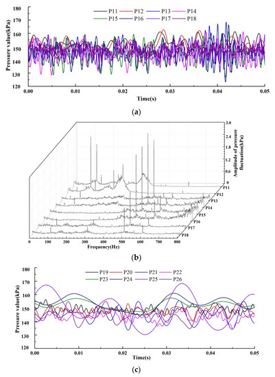 Figure 9c,d shows the time vs. pressure and frequency vs. PF at P19–P26. At the left monitoring points P19–P22, time domain distributions of PF were different than the right monitoring points P23–P26. Frequency domain distributions at the two series of monitoring points also displayed some apparent differences. Dominant frequencies at P19–P22 were five times the axial frequency (125 Hz), 10 times the axial frequency (250 Hz), and 20 times the axial frequency (500 Hz). However, the dominant frequencies at P23–P26 were mainly low frequencies ranging from 0–300 Hz.