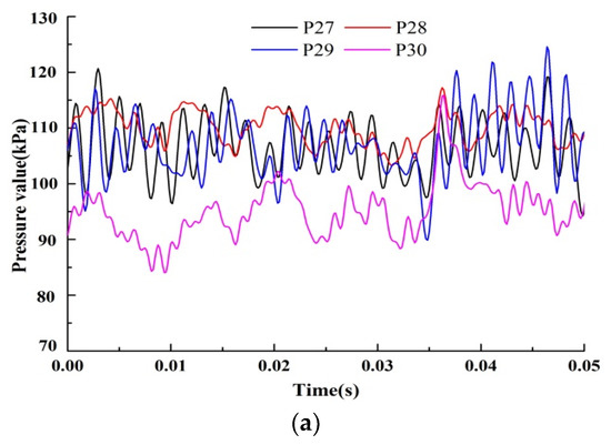- Pressure fluctuation near the outlet of the pump was larger, therefore we set up four monitoring points, P27–P30, uniformly around the outlet pipe.