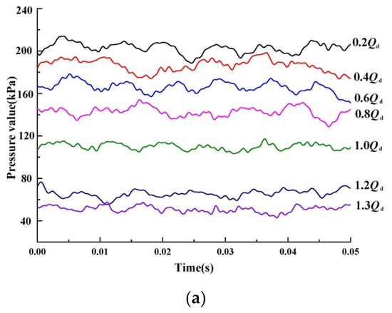 Figure 6 shows the amplitude of PF at P1–P10. Based on Figure 6, the trend of amplitudes of PF for P1–P10 were almost identical. When the flow rate increased from 0.2Qd to 0.6Qd, the amplitude of PF at P1–P10 decreased gradually and the difference among every point became less. At the lower flow rates, the amplitude of PF at every monitoring point was larger. At 0.2Qd, the amplitude of PF was the largest. As the flow rate continued to increase from 0.6Qd to 1.2Qd, the overall trend of amplitudes of PF gradually diminished. At the design flow rate, amplitude difference between the monitoring points was the largest. The maximum difference was 2.85 kPa.