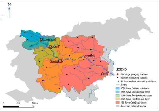 Location of the considered catchments on the map of Slovenia. Discharge gauging stations are indicated with red points. Rainfall and air temperature measuring locations are indicated with black and blue points, respectively.