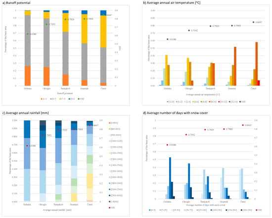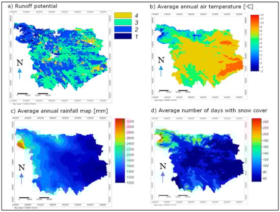 Runoff potential map (1 means A class, 2 B, 3 C, and 4 D class according to the Soil Conservation Service (SCS) methodology [], average annual air temperature map, average annual rainfall map, and average number of days with snow cover map.
