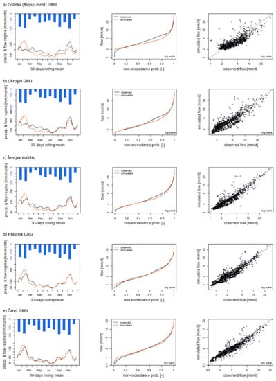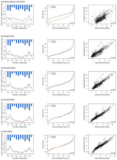 When comparing the GR6J and GR4J models one can notice that according to the KGE criterion the GR6J model is able to yield better modeling performance in case of all five tested nested sub-catchments (Table 2). This is especially evident in case of low-flow data (Figure 3 and Figure 4). However, it is evident that differences between both tested model versions are not significantly large, which is especially evident in case of graphical comparison of the mean observed and modeled discharge data (Figure 3, Figure 4 and Figure 5, Table 2). A similar conclusion can be made for the NSE criterion with the exception of the smallest catchment with the outlet at the Blejski most gauging station, where slightly better results were obtained in the case of the GR4J model (Table 2). Similar findings were obtained by [], who compared the performance of the GR lumped conceptual models with different number of parameters in the case of the Ljubljanica River catchment. They demonstrated that the CemaNeige GR6J model, which includes an additional snow routine module, yielded the best modeling results. Thus, one could argue that especially for the small catchments (e.g., Blejski most gauging station) inclusion of the additional parameters (e.g., snow module) could lead to improved modeling performance. However, it should also be noted that inclusion of the snow module would lead to two additional model parameters that should be calibrated [,].