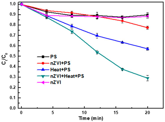 Degradation efficiencies of CAP under different processes. Experimental conditions: initial CAP concentration C0 = 1 mg/L, pH = 7.0, nZVI 20 mg/L, temperature 60 °C, PS concentration = 0.4 mM, and the solution volume 100 mL.