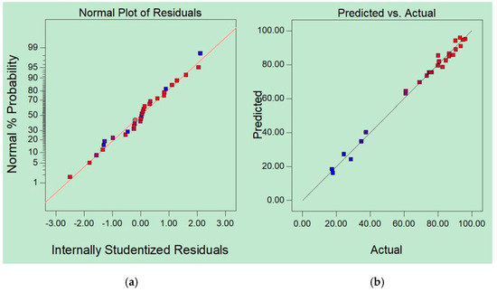 Y represents the efficiency of CAP degradation. X1, X2, X3, and X4 represent the terms of nZVI (mg), PS concentration (mM), initial pH, and temperature (°C), respectively. Generally, positive coefficients (>0) indicate favorable effects on degradation efficiency, whereas negative coefficients (<0) indicate unfavorable effects on degradation efficiency [36,38]. Based on data diagnostics, two representative graphs were obtained to verify the accuracy of proposed model. As demonstrated in Figure 2a, the points showed a good linearity and fit well with the normal distribution. According to Figure 2b, it was obvious that the predicted model could predict the degradation efficiency accurately. Thus, the established equation is creditable for the simulation of CAP degradation in the control condition.