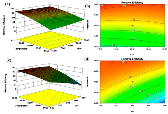 The 3D response surface and 2D contour plots of the effects of the interaction on the CAP degradation efficiency (%). (a) 3D graph of temperature and nZVI, (b) 2D graph of temperature and nZVI, (c) 3D graph of temperature and initial pH, and (d) 2D graph of temperature and nZVI.