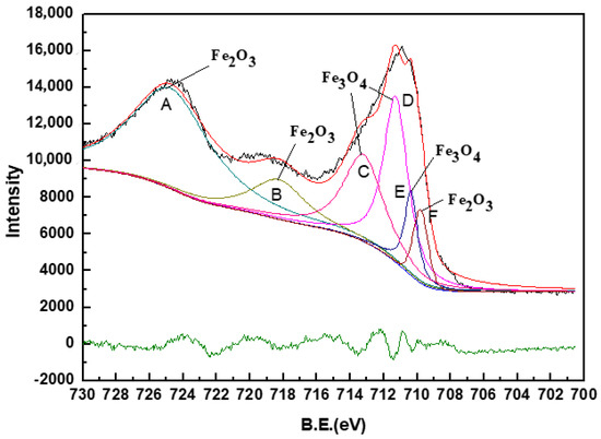 To reveal the Fe-containing species of mixed powder after reaction, XPS was employed to analyze the Fe species under the optimal condition (Figure 4). Based on the binding energies of peaks, it could be inferred that Fe2O3 and Fe3O4 were the predominant components in mixed powder. The binding energy of Fe 2p1/2 of Fe2O3 was reported to be 724.6 eV [57,58], indicating that Peak A was the spectra of Fe2O3. Peak B located in the binding energy of 718.3 eV, which could be considered as the satellite peak for Fe 2p1/2 [57,58]. Peak C was 713.4 eV, which was believed to be Fe3O4 according to previous studies [58,59]. Based on the binding energy and cover ratio, Peak D could be inferred as Fe3O4, which is consistent with the existing studies [59,60]. In addition, Peaks E and F being located in 711.2 eV and 709.8 eV could be considered as Fe3O4 and Fe2O3, respectively [58,61]. Overall, Fe2O3 and Fe3O4 were the predominant components in mixed powder.
