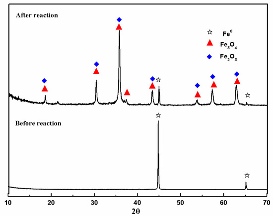 Furthermore, the XRD patterns of the crystalline structure on nZVI surface before and after reactions are demonstrated in Figure 5. Sharp reflection peaks at 44.87° and 65.24° could be indexed as the planes of Fe0 (PDF#65-4899). Thus, the nZVI sample before reactions was of high purity in iron content. Even after reactions, excess Fe0 was observed in the system. In addition to Fe0, the XRD patterns of Fe3O4 (PDF#65-3107) and Fe2O3 (PDF#39-1346) fit well with the crystalline structure after reactions. It is worth mentioning that the planes of Fe3O4 (PDF#65-3107) and Fe2O3 (PDF#39-1346) showed high similarity in major reflection peaks, probably because stoichiometric Fe3O4 could also be expressed to FeO·Fe2O3 with the Fe2+:Fe3+ ratio of 1:2 [57]. The XRD results were in line with those of XPS analysis.