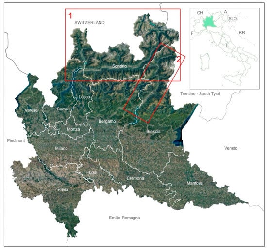 Location of the study areas in the alpine sector of the Lombardy Region: (1) Sondrio Province (Valtellina); (2) Brescia Province (Valcamonica).