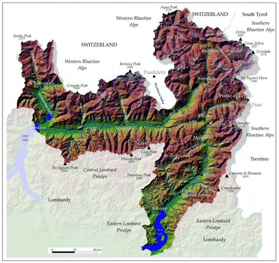 The Sondrio Province is occupied entirely by a mountain environment and includes the Valtellina valley and, secondarily, the Valchiavenna valley and the Livigno district. The Valtellina valley is a typical U-shape alpine valley derived from the Quaternary glacial processes and extends for 120 km in length between the Southern and Western Rhaetian Alps and the Central Lombard Prealps (Figure 2). It is enclosed by the Bernina Alps (Cengalo Peak, 3369 m; Bernina Peak, 4049 m; Aqua Peak, 3126 m) to the north, along the Swiss border; the Ortles-Cevedale Alps (Ortles, 3905 m; Gran Zebru’, 3857 m; Cevedale, 3774 m) to the north-east, and the Orobian Alps (Tre Signori Peak, 2554 m; Diavolo Peak, 2914 m; Coca Peak, 3050 m; Tre Confini Peak, 2588 m) to the south. The valley has prevalently E-W direction resulting from its particular tectonic setting: it is superimposed on the regional fault “Insubric Line” that separates the Austro-Alpine nappe system to the north from the Variscan basement of the Southern Alps to the south. In the middle and upper sectors, the valley turns toward NE and N, respectively. Tectonics influence also the geological setting of the Valtellina valley: the bedrock consists mainly of metamorphic and intrusive lithotypes of the Austro-Alpine basement, included cataclastic and mylonitic rocks that crop up in the proximity of the tectonic lineament, with subordinate sedimentary rocks. Glacial, fluvio-glacial, and colluvial deposits of variable thickness cover the middle-lower portion of the slopes; thick alluvial deposits occupy the main valley floor, with several alluvial fans at the outlet of the tributary valleys. The Valtellina and its minor valleys, e.g., Masino, Valmalenco, Poschiavo, Valfurva, Braulio, and Viola valleys, form the upper Adda River basin from its sources in the Ortles mountains to its inlet into Lake Como.