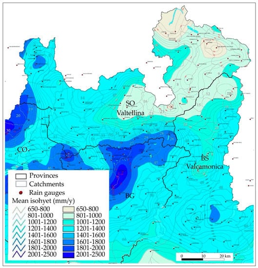 - Ceriani, M.; Carelli, M. Carta delle Precipitazioni Medie, Minime e Massime Annue del Territorio Alpino Lombardo (Registrate nel Periodo 1891–1990); Agnelli, U., Bodio, N., Colombo, S., Lauzi, S., Martelli, M., Eds.; A Cura Della Regione Lombardia, Direzione Generale Territorio ed Urbanistica: Milano, Italy, 1992. [Google Scholar]