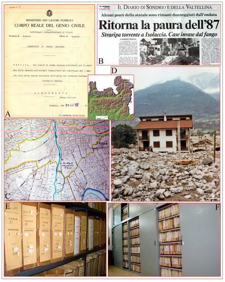 Examples of documents collected and used for the historical research of rainfall-induced landslides in the Lombardy Region. (A) Municipal archives: report on the damage caused by the debris flows of the Cortese Stream during the event that occurred on 3 August 1942 in the Verceia municipality; (B) journalistic sources; news from the “Il Giorno” newspaper on the event of 22 June 1995 in Valtellina; (C) State Archives of Brescia: detailed map of the Vezza d’Oglio municipality (Valcamonica) produced during the Kingdom of Lombardy-Venetia (around 1850); (D) images collected from local photographers: serious damage in the Fusine town (Valtellina) due to the debris flows of Madrasco Stream on 18 July 1987; (E) archive of the Lombardy Region, Sondrio local headquarters: folders containing documents concerning the interventions on the streams made towards the end of the 19th century; (F) historical archive of the CNR-IRPI of Turin: the richest Italian archive concerning floods, landslides, and mud-debris flows in Northern Italy.