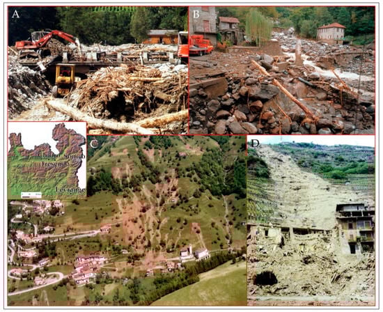Example pf shallow landslides triggered by intense rainfall in the alpine provinces of Lombardy Region: (A) view of a bridge totally blocked and overflooded by the exceptional mud-debris flow that occurred at Chiuro, Sondrio Province, on 19 July 1987; (B) view of the debris flow that occurred at Sonico, Brescia Province, on 26 September 1987, that destroyed some buildings and one bridge; (C) view of widespread soil slips that occurred at Levrange, Brescia Province, on 26 May 1981; (D) view of the soil slips triggered on a terraced slope at Tresenda, Sondrio Province, on 22 May 1983, causing severe damage to some buildings.