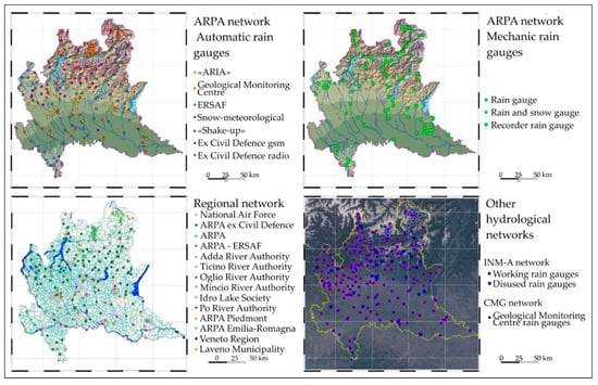 Rain gauge networks in the Lombardy Region. ARPA = Regional Agency for the Environmental Protection; ERSAF = Regional Agency for Agricultural and Forestry Services; ARIA = Aria Network consists of instruments installed near cabins belonging to the Air Quality Detection Network; INM-A = Integrated Noise Model Network; CMG = Meteorological automatic acquisition network designed for monitoring some landslides in Lombardy (Sondrio province).