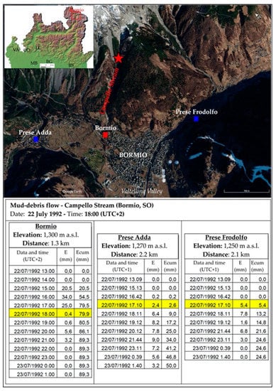 Example of variability in rainfall measurements during the short and very intense localized rainstorm that occurred on 22 July 1992 at Bormio (SO), which triggered a mud-debris flow along the Campello Stream valley [97]. The three rain gauges are located at similar altitude and distance from the slope failure but a few hundred meters lower than the triggering point and in different sub-catchment. Red star shows the triggering point of mud-debris flow. Squares represent the different type of rain gauge: mechanical (red) and automatic (blue).