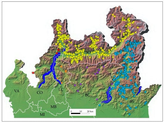 The study area comprises two of the large and most important mountain areas of the Lombardy Region and the Central- and South-Eastern Alps (Figure 1): the Southern and Western Rhaetian Alps and Central Lombard Prealps, in the Sondrio Province, and the Central and Eastern Lombard Prealps, in the Brescia Province [57] (Figure 2).