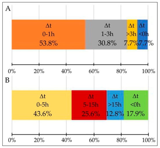 Distribution in % of the summer (A) and spring-autumn (B) events based on the period Δt (in h) between the time of the maximum recorded peak of rainfall intensity and the time of landslide occurrence. Δt < 0 h represents the period before the maximum rainfall peak.