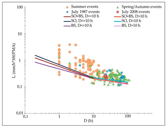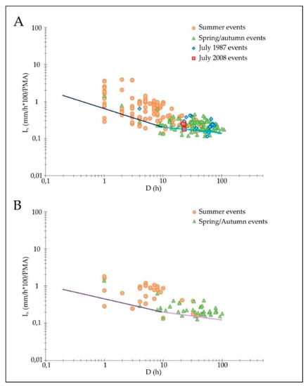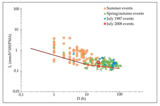 Definition of rainfall duration is essential to identify rainfall thresholds for the occurrence of landslides because it is closely correlated to the mean rainfall intensity and, consequently, to the slope of the curves. In literature, the rainfall duration, D (in h) has been determined in a variety of ways. For example, Brunetti et al. [88] measured the period between the end-time of the rainfall event, coinciding with the time of the landslide, and the start-time of the rainfall event, coinciding with the time when the rain started in the rainfall record. First of all, we measured the period between the time of the landslide and the time when the rain started in the rainfall record preceded by a minimum dry period of 12 h. By analysing the pluviogram recorded by each most representative rain gauge, we observed that short-duration heavy rainfall events, typically in summer months, were generally preceded by dry periods or prolonged very-low intensity precipitations (lower than 1 mm/h). We considered that such low-intensity rainfalls did not affect the initiation of shallow landslides, but they considerably modified the rainfall duration and, consequently, the mean rainfall intensity. Therefore, to include all the rain contributing to the landslide initiation, the rainfall duration has been determined by measuring (i) the period between the time when the rain started in the pluviogram and the time of the landslide occurrence and (ii) a preceding period of minimum 12-h with rainfall intensity lower than 1 mm/h. We considered both conditions to measure rainfall duration, except for some rainfall events extended over a period of several days (more than 5–6 days), typically in spring and autumn months, for which we measured the rainfall duration using only the first condition. In these cases, we observed that the preceding 12-h periods of very-low rainfall intensity (<1 mm/h) were alternated by very heavy showers, which played a not negligible role in triggering landslides.