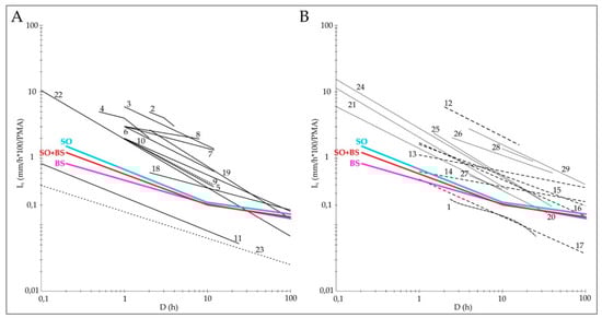 Comparison between the rainfall thresholds defined for Central- and South-Eastern Alps sectors of the Lombardy Region (SO + BS, red curve) and the Sondrio (SO, sky-blue curve) and Brescia (BS, fuchsia curve) Provinces and IND curves available in literature for similar mountain areas in Italy and worldwide (Table 3): global (broken black curves) and regional (continuous black curves) (A) and local (broken black curves) or at single catchment scale (dotted black curves) (B).