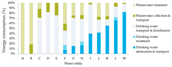 This set of 13 water utilities is also representative in terms of energy consumption per UWS stage. As shown in Figure 2, illustrating the energy baseline of these 13 utilities established for the Avaler+ project, two utilities (A, B) are only responsible for wastewater systems, in Utility M the proportion of energy consumption in wastewater system is minimal, and the remaining utilities cover the distributions between these extremes.