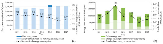 Water Utility K’s energy baseline between 2011 and 2017 for energy consumption and Standardised energy consumption by (a) drinking water systems, (b) wastewater systems.