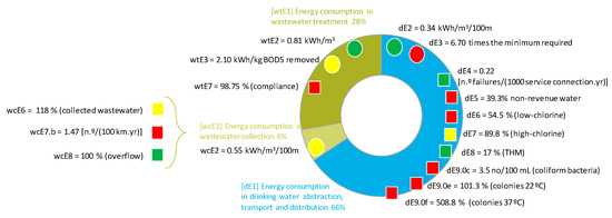 To characterise the profile of the systems under analysis, there is an additional set of context PIs (not shown) on service coverage, energy consumption (e.g., energy consumption for pumping and for treatment in drinking water systems per authorized consumption), energy production (e.g., energy production from hydropower and biogas in UWS per total energy consumption) and GHG emissions.