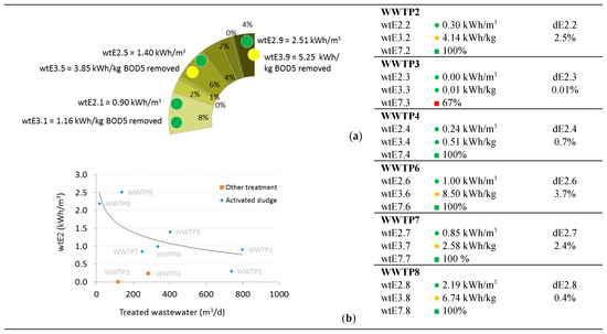 Energy consumption, energy efficiency and effectiveness in Utility K, for (a) wastewater treatment stage (level 3 of analysis) (the pie charts represent the energy consumption in each wastewater treatment plant in brownish-green; the circles represent the energy efficiency PIs and the squares the effectiveness PIs) and (b) energy consumption (wtE2, kWh/m3) vs. treated wastewater (m3/day).