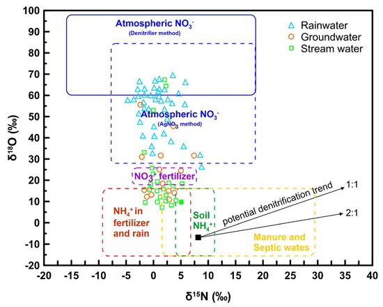 As previously mentioned, the analyzed nitrate δ15N and δ18O isotope ratios provide distinct values for each contaminant source. The value of δ15N in atmospheric NO3− is usually in the range of −15‰ to +15‰ [9,89]. This large range is due to complex chemical reactions of nitrates or related compounds in the atmosphere, seasons, meteorological conditions, types of anthropogenic inputs, proximity to pollution sources, distance from the ocean, etc. [90]. Synthetic nitrogen fertilizers have δ15N values in the range of −4‰ to +4‰ [79] and the δ15N value of nitrogen in the soil ranges from −2‰ to +5‰. However, manure and sewage can be more enriched in 15N due to volatilization of 15N-depleted ammonia, and oxidation of much of the residual waste may result in high δ15N of nitrate [79]. By this process, the δ15N value becomes significant with a range of +10‰ to +20‰ [91,92]. Hence, the δ15N is an important indicator of nitrates in the atmosphere, fertilizers, soil, manure and sewage. However, the identification of nitrogen sources and cycles using δ15N values alone is limited because the ranges of values from precipitation, soil, fertilizer, manure, and sewage show substantial overlap (Figure 2). The analysis is therefore used in combination with δ18O, another indicator for identifying and separating sources of nitrates, in order to reduce the uncertainty of nitrogen isotopes in the identification [3,18,79,93,94,95,96].