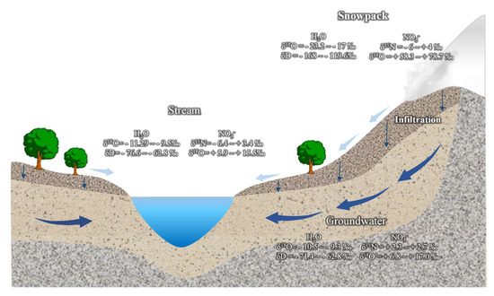 After reaching the ground, precipitation moves from the surface to the stream, which gradually alters the water isotope composition [42]. These processes typically involve two flow pathways, which are direct and indirect. The direct pathway is the runoff of surface water from rainfall or melting snowpack into the stream water, while the indirect pathway is the vertical movement of dissolved nitrate through the soil profile into the groundwater, after which the groundwater can be flushed out and contribute to the stream water [16,38]. In these processes, the potential sources of nitrates in stream water are atmospheric via rainfall and snowmelt [3], mineralization of soils under snowpacks [106], groundwater [107,108,109], nitrification [3,12,93], or a combination of these [110]. As mentioned previously, the δ18O values of nitrates from atmospheric sources differ significantly from those of groundwater nitrates originating from nitrification in the soil. Thus, if rainfall and surface water run off directly to the stream, the δ18O value of nitrate is similar to that of the atmospheric source. However, if precipitation is infiltrated into the soil layer and then recharged to groundwater and released into the stream water, the isotope composition of the stream water is similar to that of the groundwater or soil water. As shown in Figure 2, if the isotopic composition of rainwater and groundwater is determined, the typical isotope values of nitrogen and oxygen can be used to identify the source of stream water and the relative contribution rate.