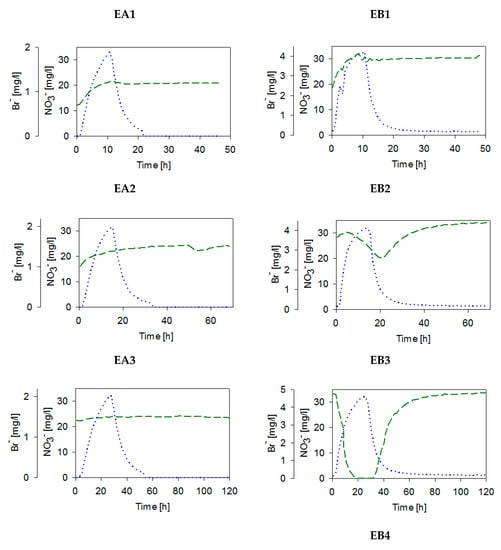 The input concentrations of nitrate were about 35 mg/L in the E-columns. The concentrations measured in the abiotic column were lower, which is also the consequence of analytical issues as the presence of azide interfered with nitrate in the interpretation of the results from ionic chromatography. The nitrate concentration stayed stable in the abiotic columns during all the experiments. In the biotic columns, nitrate was stable during the first experiment, with the fastest flow. In the second experiment, nitrate decreased for the first 20 h, reaching concentrations of 20 mg/L; afterwards, the concentrations increased, reaching the input concentration. In the third experiment of column EB, nitrate disappeared completely after 20 h. It appeared again 34 h after the start of the tracer injection while the tracer injection was stopped after 24 h (Figure 5).