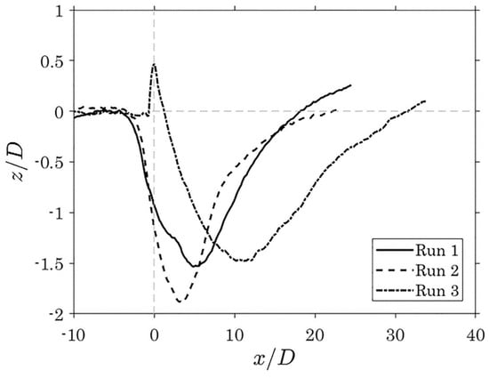 The centerline longitudinal bed profiles at equilibrium, for each experimental run, are shown in Figure 2. Here, the origin of the x-axis (streamwise direction) is set in correspondence of the cylinder center, whereas the z-axis indicates the vertical direction. Specifically, the horizontal and vertical axes were made dimensionless by dividing them by the cylinder diameter. Furthermore, z/D = 0 is the bed surface at the start of each experiment. These longitudinal profiles were extracted from the bed surface models derived from the photogrammetry technique.