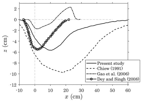 The obtained bed profile at equilibrium for e = 0 (Run 2) was compared with the experimental data of Chiew [3], Gao et al. [20] and Dey and Singh [4]. To better understand the different behavior that can be observed in Figure 3, Table 2 shows the experimental conditions adopted for each run. The bed profiles of Gao et al. [20] and Dey and Singh [4] were determined in deep-water condition (h/D > 5), whereas those related to the studies conducted by Chiew [3] and of the present work were in shallow-water condition (h/D < 5). Therefore, it is easy to note that for shallow-water condition a deeper and longer scour hole is formed, leaving aside for the moment considerations about the other parameters involved. Furthermore, in the case of deep-water condition the scour hole develops to great extent below the cylinder, whereas for shallow-water the maximum scour depth is reached downstream of it. By comparing the bed profile of Run 2 and that of Gao et al. [20], which are characterized by similar cylinder diameter and flow velocity, the higher water depth of Gao et al. [20] produced a maximum scour depth of about 1.8 cm, whereas that obtained in the present study was about 5.7 cm, although d50 was 4 times less than 1.53 mm of Run 2. However, it must be pointed out that also the considered equilibrium time (te) can influence the observed discrepancies between the bed profiles. Based on results obtained from Chiew [3], only 50–70% of the equilibrium scour depth is reached in three to four hours of testing. Finally, by comparing the bed profile of Run 2 and that of Dey and Singh [4], which are characterized by a similar sediment size, it is possible to note that the maximum scour depth is of the same order, despite the fact that D and U are higher than those of the present study. This can again be ascribed to both the water depth and also to the equilibrium time.