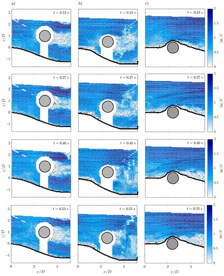 A sequence of four consecutive instantaneous flow fields at different times t for all the experimental runs are shown in Figure 4. The velocity has a magnitude , where u and w are the instantaneous streamwise and vertical velocity components, respectively. The velocity was made dimensionless by dividing it by U. The origin of the x-axis refers to the start of the test section acquired with the PIV system. Both the axes were made dimensionless by dividing by D. Furthermore, Figure 4 shows the streamlines for each velocity field. Note that invalid vectors were removed from the instantaneous velocity fields (blank areas in the colormaps), as well as those below and along the edge of the cylinder since they corresponded to an area poorly illuminated by the laser. Vectors identified as spurious were replaced by the ensemble-averaged values when computing the average over time.