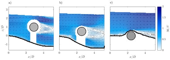 The analysis of Figure 5 recalls the separation of the main flow upstream to the cylinder in both Run 1 and Run 2, described on the basis of the instantaneous velocity fields of Figure 4. It is apparent that the increase of the gap between the cylinder and the bed surface (Run 1) causes the formation of two opposite vortices in the wake of the cylinder shorter and more compressed than those of Run 2. This behavior may be attributed to the fact that in Run 1 the cylinder is close to the water surface, pushing down the upper vortex. In the meantime, a greater amount of flow passes below the cylinder and, therefore, tends to expand immediately downstream of it, compressing the vortex system in the wake region. The velocity at the underside of the cylinder is slightly lower than the one at the top side. This is in agreement with the observations of Jensen et al. [29]. The ensemble-averaged velocity field of Run 3, instead, shows the roller vortices upstream to and downstream of the cylinder in the scour hole, as discussed before. This led to a flow acceleration along the water depth above the recirculation zone.