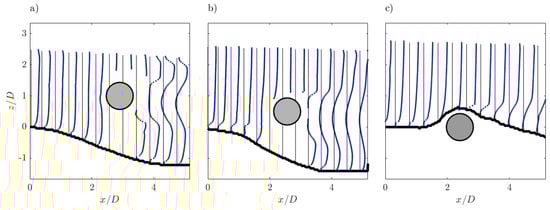 Figure 6 shows the vertical profiles of the ensemble-averaged streamwise flow velocity at different distances upstream to and downstream of the cylinder. Again, it is illustrated how the velocity profiles are not influenced by the horizontal cylinder at the beginning of the area of interest, in all the three experimental runs. For Run 3 only, negative values of are shown upstream to the cylinder, owing to the presence of the vortex originated from the interaction between the current and the obstacle. Immediately downstream of the cylinder in Run 1 and Run 2, the streamwise flow velocity is negative, indicating a reverse flow. Increasing the distance from the cylinder, it loses intensity and the vertical profiles start recovering the undisturbed upstream condition. However, the velocity profiles are different if we refer to Run 3, in which the shear layer separates from the cylinder, creating a recirculation zone.