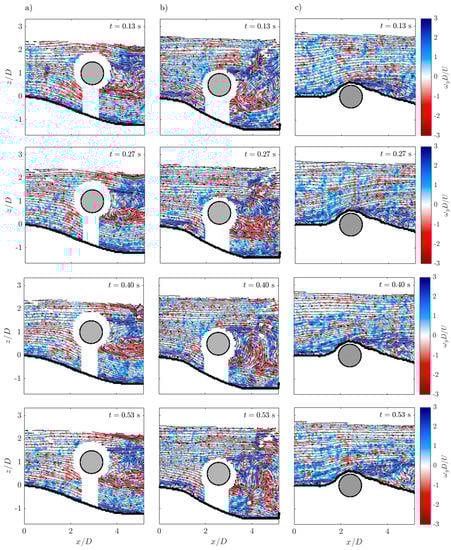 The Strouhal number in proximity of a wall may change with respect to the case in which no wall is present. Shedding frequency tends to increase (yet slightly) as the gap ratio decreases [44]. However, the flow field in this study was analyzed at the equilibrium phase, that is when the scouring phenomena was already exhausted. This means that the gap between the cylinder and the bed is 4.27 cm and 3.43 cm for Run 1 and Run 2, respectively (Figure 2). Therefore, since the gap ratio is higher than 1 for Run 1 and Run 2 (1.42 and 1.14, respectively), it is possible to assume that in these cases the Strouhal number in proximity of the wall is equal to the Strouhal number for wall-free cylinder [44,45]. Note that the vortex shedding occurs in a region where the scour hole is deeper than that at the cylinder itself (e1/D > 1.42 and e2/D > 1.14 for Run 1 and Run 2, respectively). Therefore, the wall represented by the mobile bed has no effects on the Strouhal number, even if concave and not flat. Considering that for a smooth circular cylinder St remains practically constant at the value of 0.2 for 300 < Rec < 3 × 105 [46], the vortex-shedding frequency can be determined as St × U/D, thus 1.87 s−1 for Run 1 and Run 2. This means that vortex shedding occurs about twice per second. Figure 4 helps in visualizing the formation and destruction of the vortex system, from t = 0.13 s to 0.53 s, with t = 0 at the beginning of the experimental measurements. The vortex originated from the free-stream side of the cylinder (e.g., Figure 4b at t = 0.13 s) is strong enough to draw the opposing vortex (at the cylinder wall-side) downstream across the wake region (e.g., Figure 4b at t = 0.27 s). Note that the streamlines coming from above are oriented in the clockwise direction, while the others in the anti-clockwise direction. The opposite sign will then cut off further supply of vorticity to the upper vortex from its boundary layer [43], and therefore this vortex is shed and the transported downstream by the flow (e.g., Figure 4b at t = 0.40 s). Thus, a new vortex forms at the free-stream side of the cylinder. However, the lower vortex is now stronger than this new upper vortex and, therefore, this will lead to its shedding (e.g., Figure 4b at t = 0.53 s). Instead, for Run 3 a reverse roller is formed in the wake region. Vortex shedding is suppressed by the presence of the bed surface that causes an asymmetry in the development of the vortices [43].