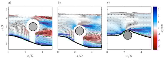 To analyze the ensemble-averaged flow field in a spatial flow domain, Figure 5 shows the streamlines and the contours of the velocity having a magnitude , where and are the ensemble-averaged streamwise and vertical velocity components, respectively. The ensemble-averaged velocity was made dimensionless by dividing it by U.
