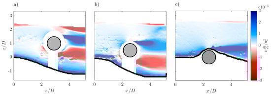 By comparing Figure 9 and Figure 10, it is evident that upstream to the cylinder the viscous stresses are negligible along the water depth and increase in the near-bed flow zone in all the experimental runs. At the same time, tends to assume a peak value at a certain distance from the bed surface and then starts decreasing. A different behavior is shown in Run 3, since a small region of negative values of is evident close to the bed surface, owing to the small vortex on the upstream front of the cylinder. Considering Run 1 and Run 2, downstream of the cylinder two regions characterized by the maximum positive and negative values of the Reynolds shear stress occur. This suggests strong turbulent mixing process in these areas, indicating a downward transport of momentum in the downstream direction and an upward transport of momentum in the upstream direction, respectively. Close to the cylinder surface, assumes the highest positive and negative values where the shear stress is almost null. As regards Run 3, both and assume their maximum values in the scour hole, which suggests a strong turbulent mixing process that entrains high-momentum fluid into the recirculation region.