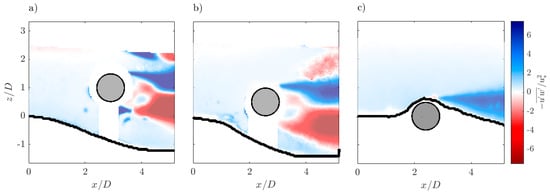 From the analysis of Figure 7, the patterns of vorticity show that in the wake region of Run 1 and Run 2 a cluster of vorticity takes place along the shear layers. This is due to the separation induced by a pressure increase along the cylinder surface. The vortex that originates from the separation zone at the free-stream side of the cylinder has a positive sign indicating a clockwise rotation, whereas the vortex from the wall-side has a negative sign with a counterclockwise rotation. These motions are responsible for the production of the Reynolds shear stresses [48]. It is also evident that for Run 2 the steep slope of the scour hole behind the cylinder forces the shear layer originating from the lower edge of the cylinder to bend upwards, thus causing the associated lower vortex to interact with the upper one prematurely, as it was observed by Jensen et al. [29]. As regards to Run 3, the vortex downstream of the cylinder rotates with clockwise direction in the scour hole, creating a recirculation zone with decelerated fluid motion. However, in all the three cases it is found that the vortices do not change their rotational sense with time; therefore, they are recursive with time.