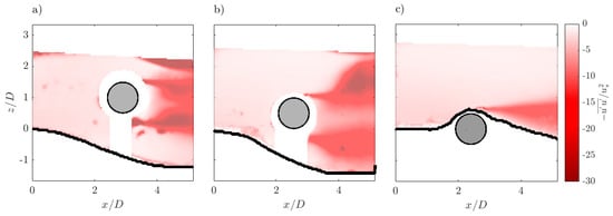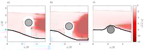 In all the experimental runs, upstream to the cylinder, it can be seen that and assume their maximum negative values in the near-bed flow region, and then they increase with z. This may be attributed to the fluid mixing that occurs in the presence of bed roughness. At the same time, it can be noted that downstream of the cylinder the intense fluid mixing induced by the presence of the obstacle enhances both the fluctuations and . The comparison between Run 1 and Run 2 shows that a smaller gap between the cylinder and the bed surface induces the flow area to enlarge with increased magnitude of both and .