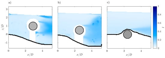 The turbulence level is high if I > 0.5, moderate if 0.1 < I < 0.5 and low if I < 0.1 [51]. Thus, the contours of the ensemble-averaged turbulence indicator for the three experimental runs are shown in Figure 13. It is clear that for Runs 1 and 2 the magnitudes of I are moderate immediately downstream of the cylinder (I ≈ 0.3), where the mean velocity is very low and a reverse flow takes place. In the wake region, the fluctuations in the streamwise and vertical directions cause the enhancement of the turbulence level, but it can be still classified as moderate (I ≈ 0.5 for Run 1 and I ≈ 0.4 for Run 2). However, the area characterized by the enhancement of the turbulence level is greater in Run 2 than in Run 1, since in this case it interests the entire flow depth. This can be ascribed to the fact that the increase of the gap between the cylinder and the bed surface (Run 1) causes the formation of two opposite vortices shorter and more compressed than those of Run 2. This also leads to higher I value in Run 1 than in Run 2. As regards Run 3, the turbulence level reaches a maximum value of about 0.4 in the scour hole downstream of the cylinder and, therefore, it can be classified as a moderate one. Nevertheless, in the rest of the flow domain, the turbulence level is basically low and it decreases as z increases, implying that the roughness effects and the influence of the cylinder diminishes owing to the damping in and , which is visible also in Figure 11 and Figure 12.