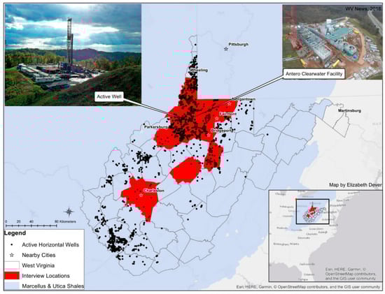 Map of West Virginia by Elizabeth Dever depicting locations of active horizontal wells, nearby cities, and interview locations within the Marcellus and Utica shale.