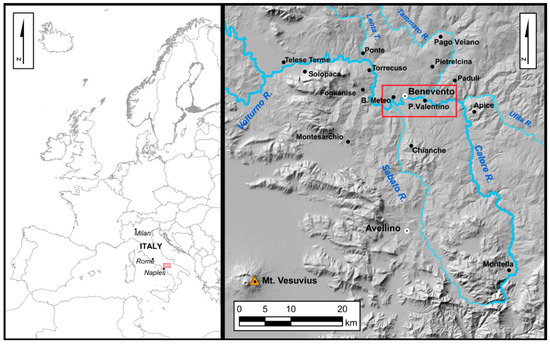 - Ciarcia, S.; Magliulo, P.; Russo, F.; Valente, A. Osservazioni geologiche e geomorfologiche preliminari sul bacino pleistocenico intermontano di Benevento (Appennino Campano). In Evoluzione Geomorfologica di Lungo Termine del Paesaggio nell’Italia Meridionale: Il Contributo delle Università Locali; Rosskopf, C.M., Aucelli, P.P.C., Eds.; Università degli Studi del Molise, Associazione Italiana di Geografia Fisica e Geomorfologia (AIGeo): Ripalimosani, Italy, 2014; pp. 125–141. [Google Scholar]