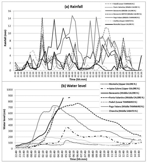 After several tens of minutes of light rain, the event started approximately at 22:40 p.m. (Figure 2a) and was recorded simultaneously in the Benevento Meteo, Benevento, Ponte Valentino, Paduli and Pago Veiano rain-gauge stations (see Figure 1 for locations). In the Benevento Meteo station, 14.2 mm of rain fell in less than 10 min. In the Benevento area, the event was particularly intense till 01:00 p.m. From 0:10 a.m., it mainly affected the middle Tammaro River basin, as highlighted by the high rainfall peaks recorded at the Pago Veiano rain-gauge station (Figure 2a). From 01:50 p.m., the lower Tammaro River basin (Paduli rain-gauge station) was also severely hit by heavy rain. The event progressively decreased in intensity and ended approximately at 04:10 a.m. in all the considered stations (Figure 2a).