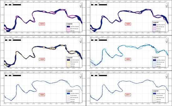 As previously stated, in this study a methodological approach based on the morphometric and multi-temporal analysis of the recent channel adjustments as a first step in compiling the final GIS-based geomorphological map was chosen. The reason for this choice was twofold. First, most of the landforms occurring in a floodplain are produced by recent channel adjustments. Thus, the analysis of the channel adjustments can greatly help in correctly detecting, interpreting, mapping and dating the landforms occurring in the floodplain. Second, the analysis of channel adjustments is a fundamental first step in the framework of a geomorphological survey aimed at flood hazard and risk mapping. This is proved, among others, by the fact that channel adjustments are one of the main indicators used to calculate indexes (e.g., Morphological Dynamics Index; []) in several methods that were recently developed in the context of the EU Water Framework Directive (WFD; []) and Floods Directive (FD; []), which have provided a legislative background with an emphasis on the need for integrated approaches for effective river management. Furthermore, the methodological approach used in this study also allowed producing cartographic tools, which could be useful in floodplain characterization, river management, and flood hazard and/or risk assessment []. The two derived maps reported in Figure 6 give examples.