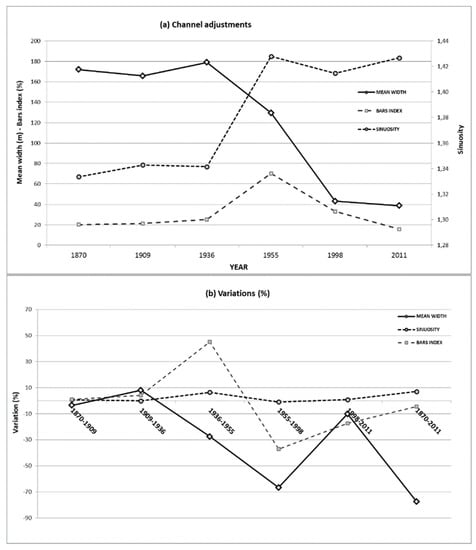 For each year of production of the used materials (Table 1), the fluvial erosional scarps (i.e., steep scarps bordering the active channel, shaped during phases of channel incision), the bars (i.e., sedimentary bodies within the active channel) and the low-flow channels (i.e., the channels during low-flow stages) were manually digitized in a GIS environment. This also allowed obtaining data about the changing, in the last 140 years, in the channel mean width, sinuosity and morphology. Channel mean width was calculated by dividing the channel area by the centerline length, while sinuosity was calculated by dividing the channel length by the valley axis length []. The ratio between the fluvial bars area (BA) and the active channel area (CA) was also calculated and expressed in percent (hereinafter, BA/CA index). The variations in the considered parameters (mean width, sinuosity, BA/CA index) were expressed by calculating differences in the considered parameter values between two consecutive years of topographic maps and/or aerial photo production (e.g., 1870–1909; 1909–1936; and so on). Each calculated difference was then divided by the value of the considered parameter on the older map/aerial photo. The result was finally expressed in percent.