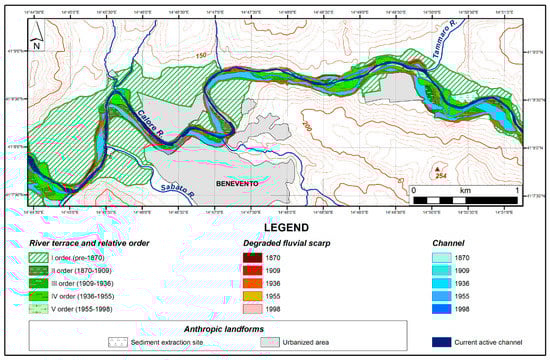 As underlined in the “Materials and Methods” section, because most of the landforms occurring in a floodplain are produced by channel adjustments, the multi-temporal and morphometric analysis of the channel adjustments experienced by the Calore River in the studied area in the last 140 years was the first step in the compilation of the GIS-based, object-oriented geomorphological map. The main results of such analysis are reported in Figure 3 and Figure 4.