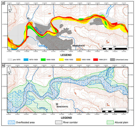 Derived maps, produced by means of queries based on the attributes stored in the geodatabase associated to the GIS-layer of the geomorphological map shown in Figure 5. (a) Map showing the different period of formation of the different sectors of the investigated portion of the Calore River floodplain; (b) map showing the spatial relationships between the “river corridor”, the investigated floodplain, and the areas overflooded during the 15 October 2015 event.