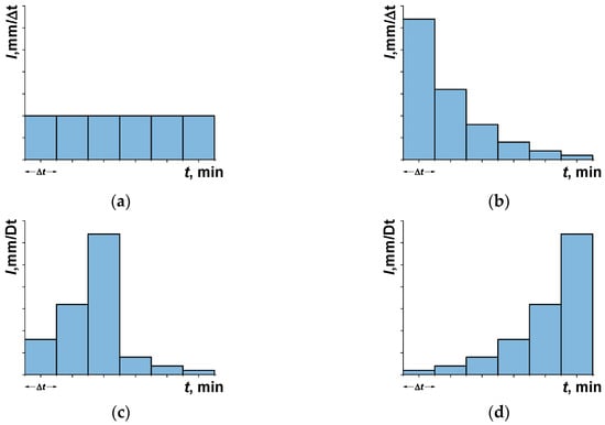 Typical rainfall intensity distributions over time, according to DVWK []: (a) constant intensity precipitation (i.e., block precipitation), (b) precipitation with a maximum intensity at the beginning, (c) precipitation with a maximum intensity at the center, and (d) precipitation with maximum intensity at the end.